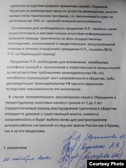 Крім того, автори звернення просять продовжити для них час перехідного періоду, оскільки малі готелі (місця в приватних будинках, які здаються відпочивальникам) до кінця року не встигнуть привести свою господарську діяльність у відповідність до російського законодавства. «Вимоги російського законодавства справедливі, але значно жорсткіші за українські, що стосується сертифікації, санітарних норм, стандартів обслуговування, фіскальних заходів. Для приведення параметрів малих готелів у відповідність до нових вимог необхідні додаткові час і чималікошти », – йдеться в документі.