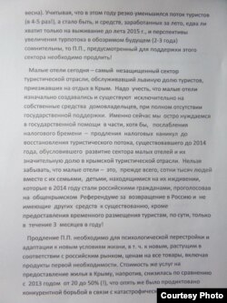 Цікавий лист кримських готельєрів ще й тим, що дозволяє певною мірою оцінити реальність становища, в яку потрапив туристичний бізнес півострова. Автори листа говорять про скорочення кількості туристів у 4-5 разів! Представники окупаційної влади Криму утримуються від подібних оцінок, обмежуючись цифрою в 3 мільйони відпочивальників.