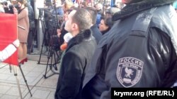Перше урочисте зібрання з нагоди річниці заплановане біля Державної Ради Криму. Територія перед парламентом оточена співробітниками поліції і представниками самооборони. Охочі потрапити всередину мали пройти через металеву рамку.
