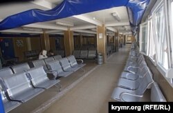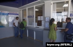 Новенька будівля кас з державними прапорами Росії, Криму та Керчі – це такий червоно-біло-смугастий пункт.