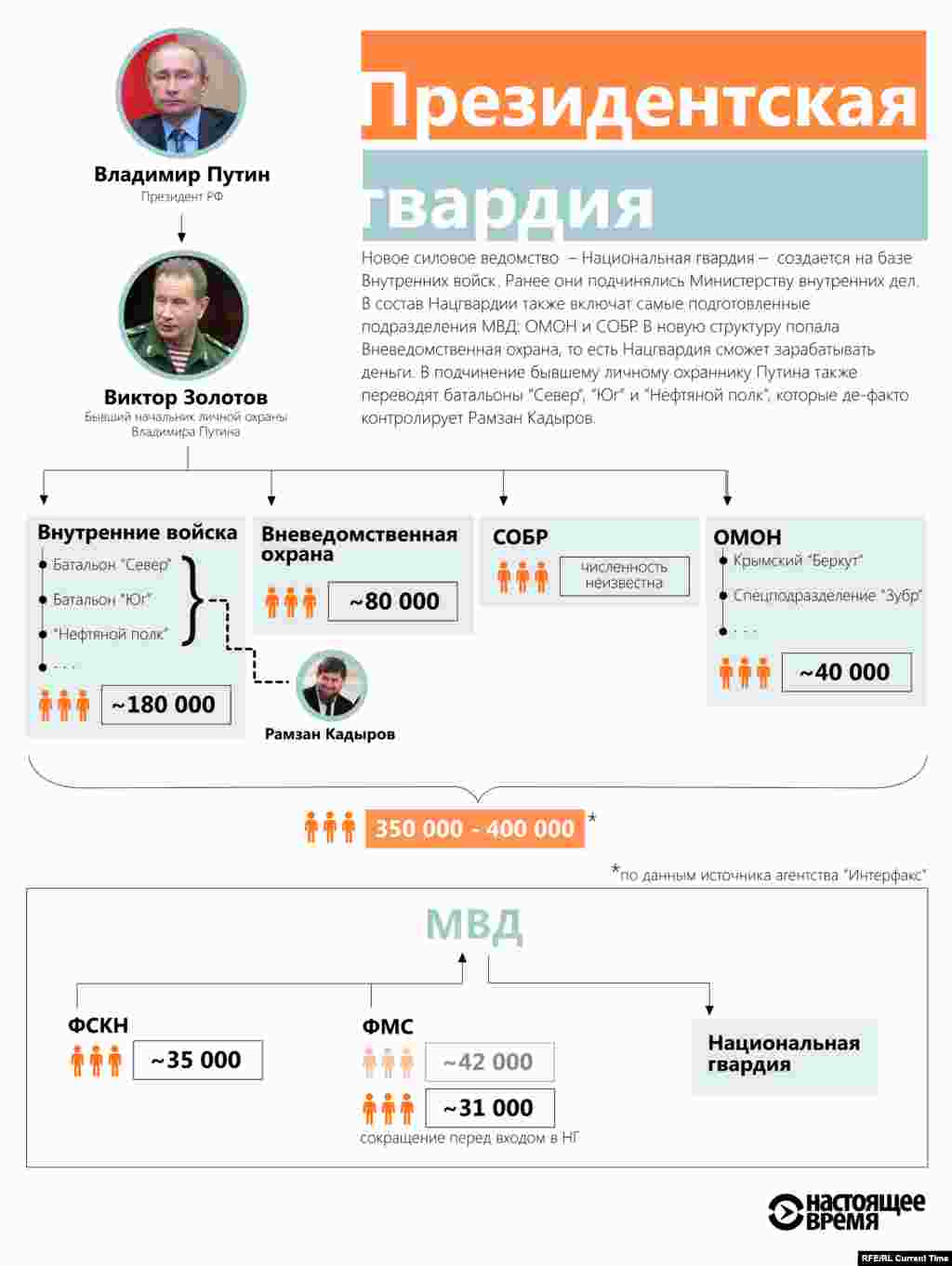 Президент Російської Федерації Володимир Путін 5 квітня оголосив про створення в Росії Національної гвардії. Новий орган займатиметься боротьбою з тероризмом і організованою злочинністю, його главою призначений колишній охоронець президента Віктор Золотов. Кого передадуть йому в підпорядкування – інфографіка Настоящего времени.