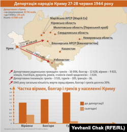 До війни вірмени становили 1,2 відсотка населення півострова, греки – 1,8 відсотка, болгари – 1,4 відсотка. В результаті депортації їх сукупна частка в структурі населення півострова впала в шість (!) разів і сьогодні становить: вірмен – 0,5 відсотка, греків – 0,13 відсотка, болгар – 0,09 відсотка.