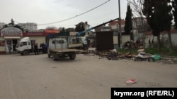 Рано вранці 23 березня евакуатори почали зносити торгові об'єкти на площі 50-річчя СРСР у Севастополі. Власники торгових точок кажуть, що демонтаж почали без попередження. До того ж, їм заборонили зносити кіоски власними силами.
