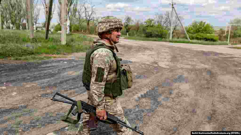 Український військовий Сергій патрулює вулицю населеного пункту. Донецька область, 28 квітня 2022 року