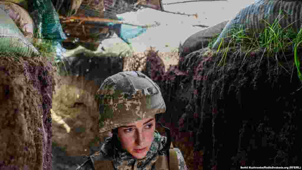 Український військовий йде в окопі на позиціях на лінії фронту. Донецька область, 28 квітня 2022 року
