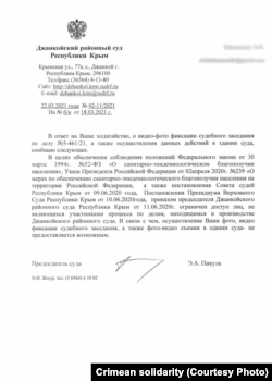 За її словами, громадянські журналісти «Кримської солідарності» зібрали цілу теку письмових відмов з боку російських судів, де вони, посилаючись на епідеміологічну ситуацію, відмовляють кореспондентам у присутності на засіданні. Одна з таких є в розпорядженні редакції (персональні відомості кореспондента приховані з міркувань безпеки ‒ КР).