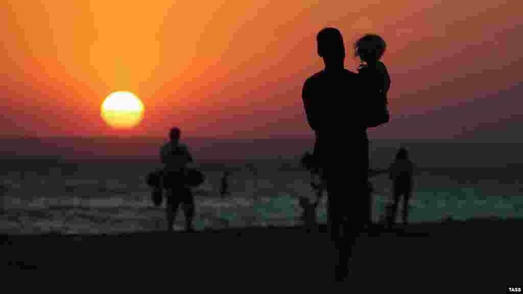 Відпочивальники разом із дітьми зібралися на пляжі в селі Поповка (Сакський район), щоб подивитися, як за горизонт заходить сонце.