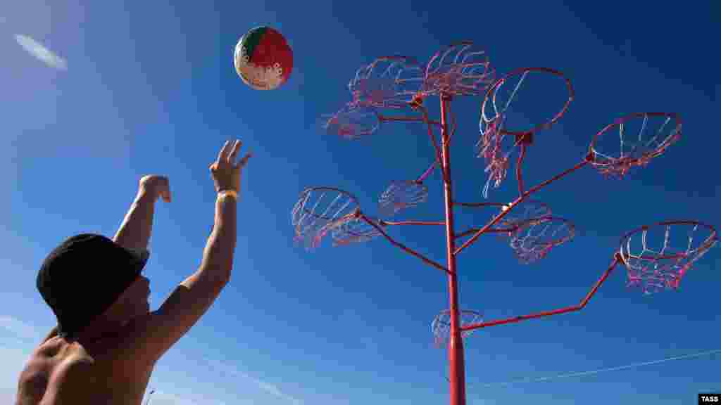Юнак намагається потрапити в одне з баскетбольних кілець, встановлених у селищі Оленівка, що на мисі Тарханкут.