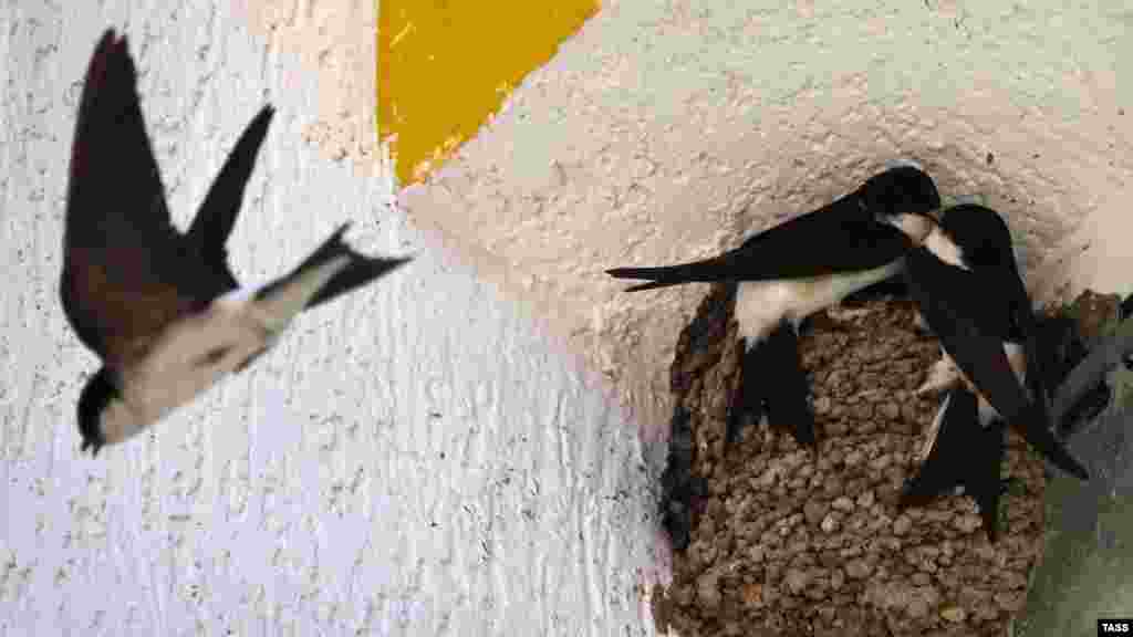 Білогірськ: пара ластівок біля свого гнізда, облаштованого на одній з міських адміністративних будівель.