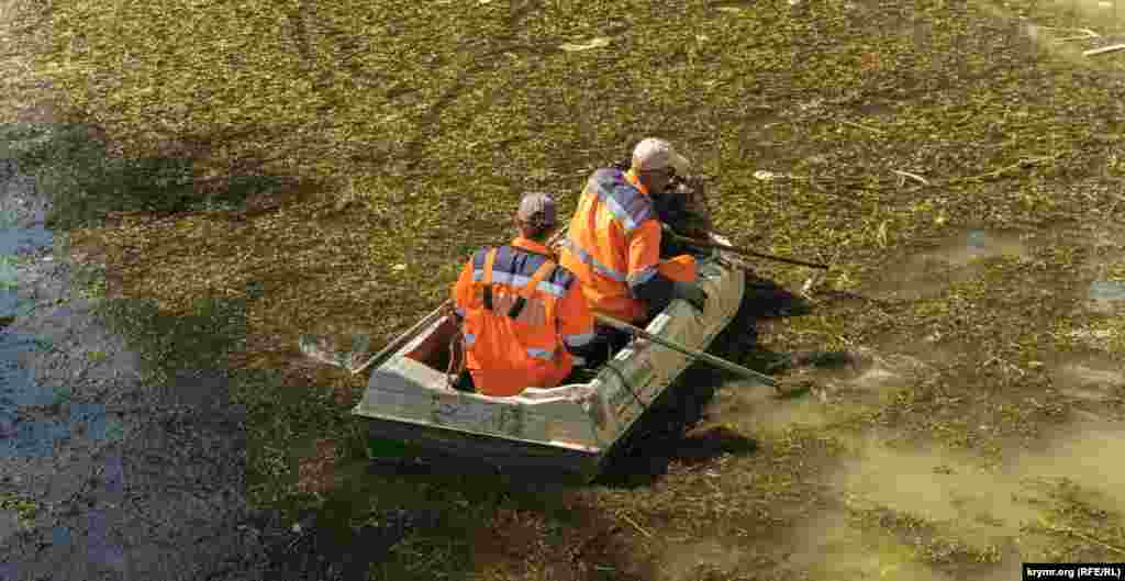 «З водоростями вручну боротися практично марно: ми можемо обірвати тільки верхівку, а корінь зі стеблом залишається», – розповідають робітники кореспонденту Крим.Реалії.