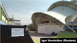 Колишній фестивальний майданчик досі огороджений будівельною стрічкою з наклейками «Територія опечатана». Аналогічні оголошення розміщені на багатьох інших об'єктах пляжу. На фото видно, що на опечатаній території опинилася й частина інфраструктури пляжу ‒ стійка з душем.