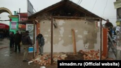 У центрі Сімферополя знову зносять магазини. Біля входу в центральний ринок Сімферополя на перетині вулиці Козлова та проспекту Кірова демонтуються кілька торгових об'єктів.