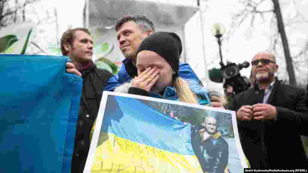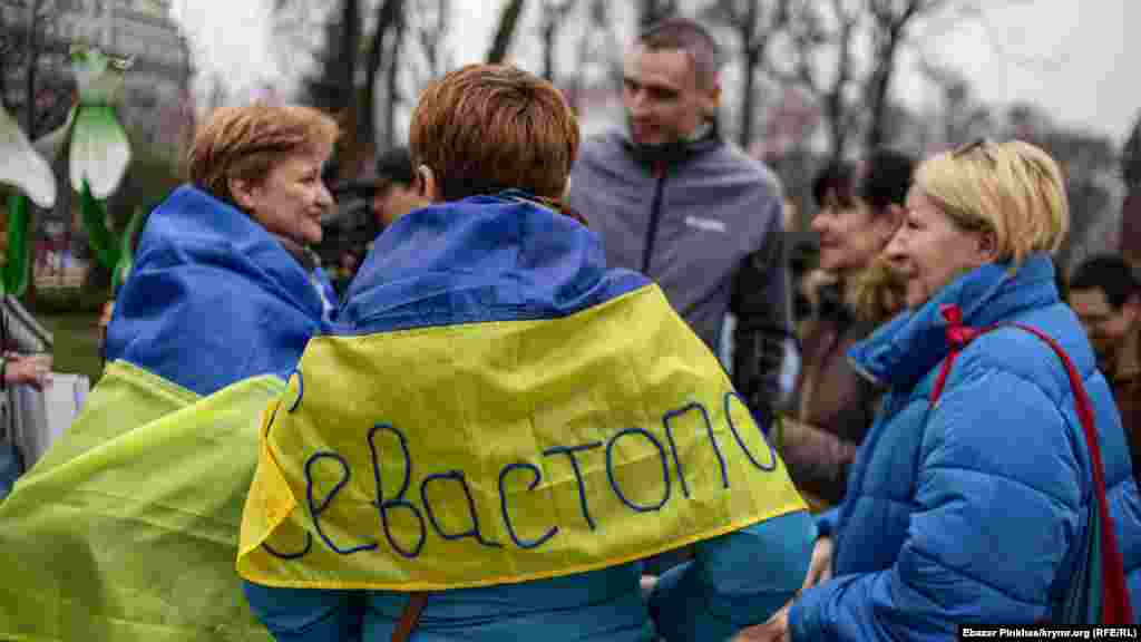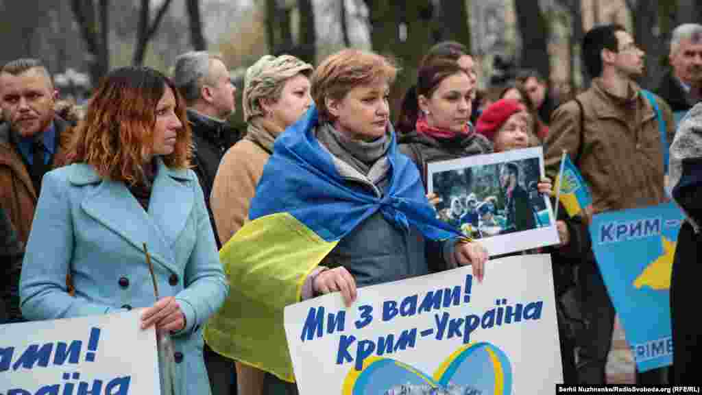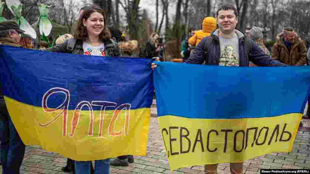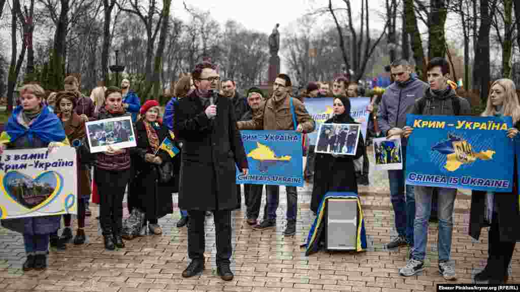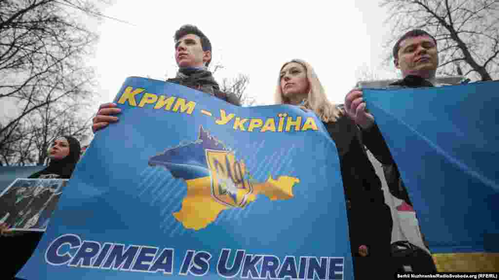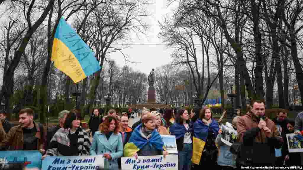 У Києві біля пам'ятника Тарасу Шевченку пройшла акція солідарності в боротьбі проти анексії Криму. Дата вибрана не випадково: 206 років тому 9 березня народився український поет, письменник і художник Тарас Шевченко, а в 2014 року 9 березня стало одним з головних днів боротьби проти російської окупації в Криму.