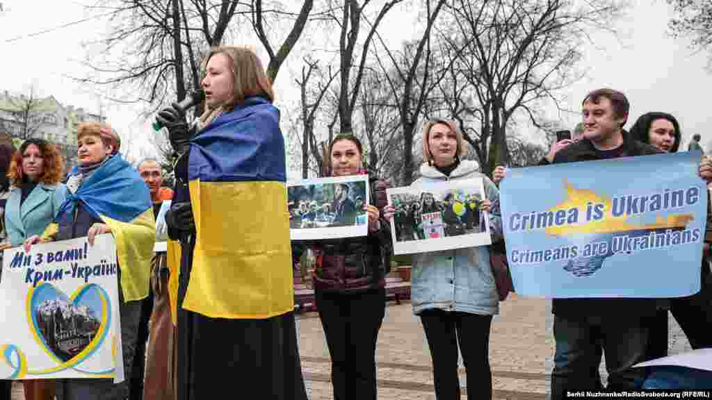 Присутні дійшли до парку імені Тараса Шевченка з українськими і кримськотатарськими прапорами, плакатами «Крим – це Україна» і фотографіями, на яких зображені кадри акцій на підтримку територіальної цілісності України в Криму. Учасники акції співали гімн України, а також зверталися до жителів півострова зі словами підтримки.