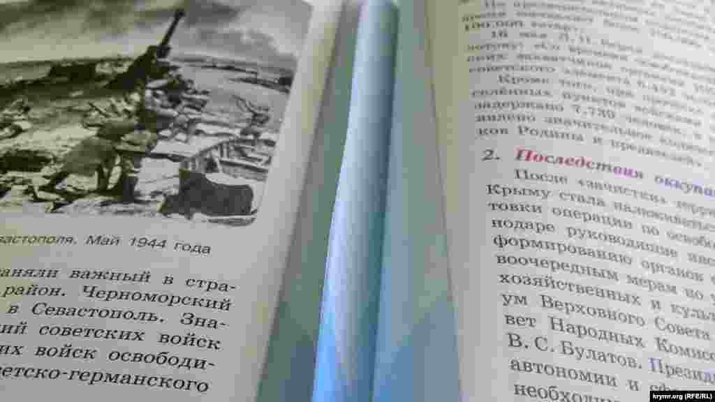 У школи анексованого Криму повернули підручники з історії для 10-х класів, в яких, на думку правозахисників, містяться висловлювання, «що розпалюють ненависть до кримськотатарського народу» через главу про «кримських татар-колаборантів» у роки Другої світової війни. Тільки тепер з них вирізали сторінки, де було зазначено, що під час Другої світової війни «більшість татарського населення лояльно ставилася до німців, а багато хто активно допомагали». Загалом у підручнику вирізали 6 сторінок.