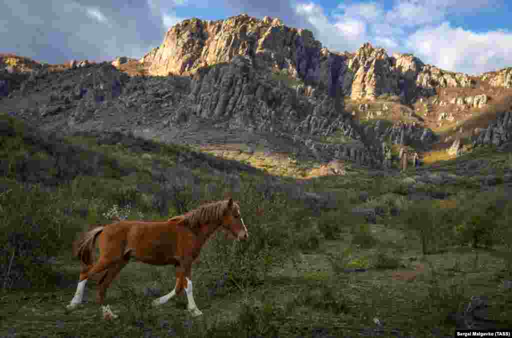 Демерджі-яйла. Вечірнє сонце пробивається крізь хмари над Алуштою. Захід сонця забарвлює в жовтий колір гірські виступи. Підніжжя тим часом – у тіні. На лузі під горою пасуться коні.