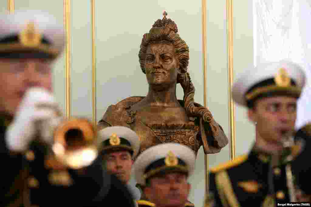 Військовий оркестр грає на святкуванні Дня Чорноморського флоту Росії в Севастополі. В рамках запланованих заходів у Будинку офіцерів відкрили Катерининський зал, названий на честь російської імператриці. Одним з елементів залу став бюст Катерини II.