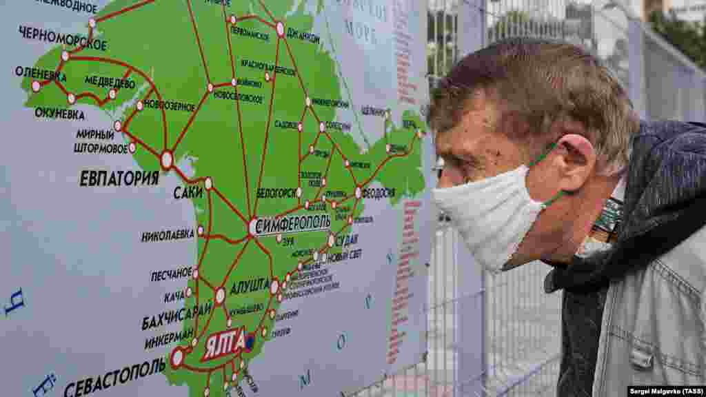 У Криму з 22 травня відновили транспортне сполучення всередині регіону. Раніше, з 2 квітня, рух автобусів і тролейбусів між містами Криму було призупинено через пандемію коронавірусу. На фото – чоловік розглядає мапу півострова на автовокзалі в Ялті.