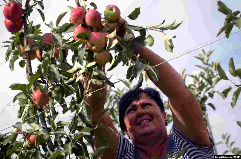 Поки на заході Криму ловлять кефаль, у північній частині півострова дає про себе знати сезон яблук. На фото сади в околицях села Калініного Красногвардійського району. Співробітниця підприємства «Золоті фрукти Криму» збирає врожай стиглих фруктів.