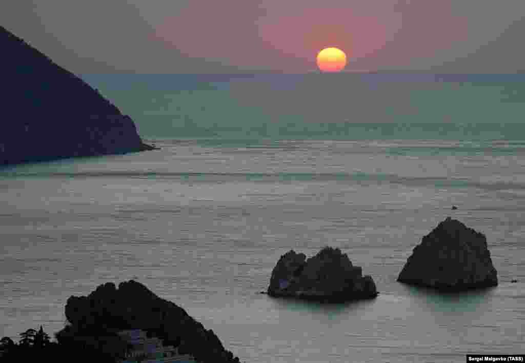 Схід сонця над Адаларами поблизу Гурзуфа. Скелі-близнюки – одна з візитівок Південного узбережжя Криму. Про них складали легенди і співали пісні, а в минулому Адалари були з'єднані з узбережжям перемичкою. Але поступово море зруйнувало її, і скелі залишилися острівцями за пару сотень метрів від суші. До слова, назва Адалари перекладається з кримськотатарської як «острови».