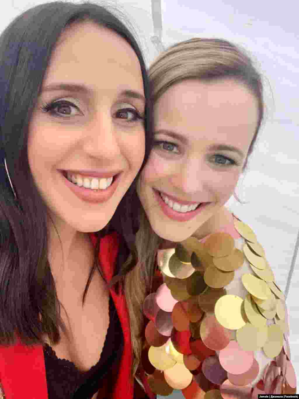 Українська співачка кримськотатарського походження Джамала і канадська актриса Рейчел Макадамс на зйомках комедії «Євробачення. Історія вогненної саги».