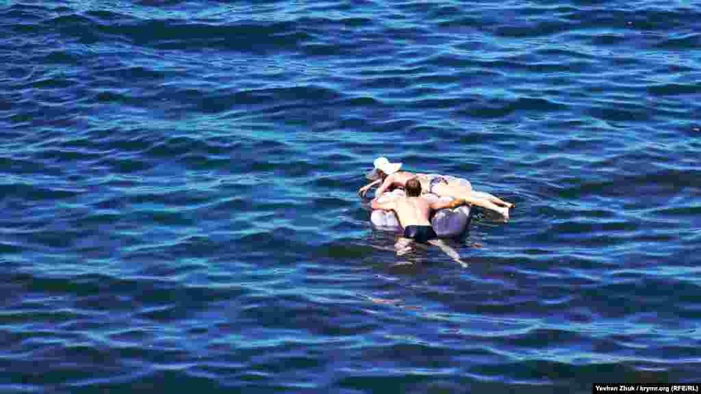Купальщики відпочивають на надувному матраці у водах бухти Ласпі, що омиває однойменне селище Севастополя. Скелі, море, гальковий пляж – мальовничий ландшафт урочища Ласпі – перетворили селище на затребуваний серед туристів і місцевих курорт.