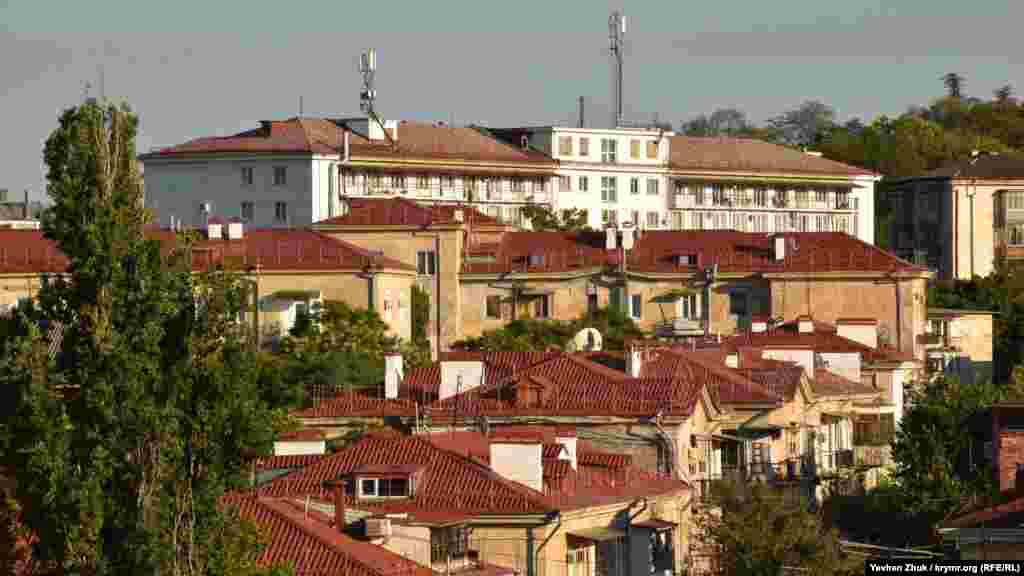 Теракотово-жовтий урбаністичний пейзаж Севастополя. Такий краєвид на споруди в центрі міста відкривається з висоти сусідніх дахів. Більше неочевидних ракурсів Севастополя дивіться невдовзі на сайті Крим.Реалії.