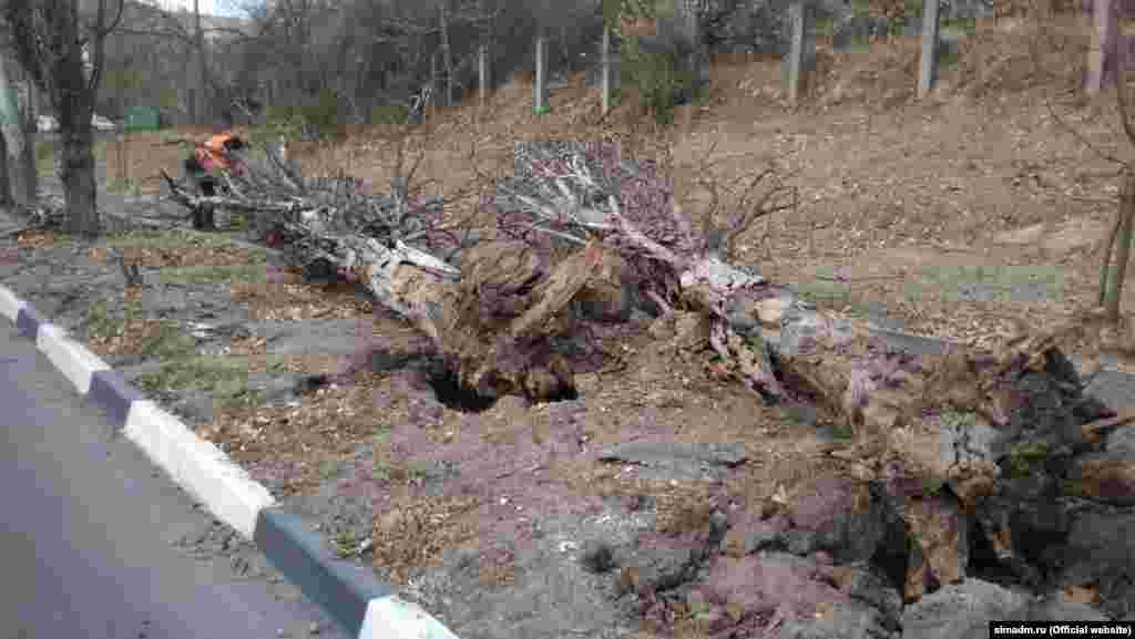 Комунальні служби Сімферополя продовжують ліквідовувати наслідки шторму.. Через сильний поривчастий вітер вулиці міста опинилися буквально завалені зламаними і вирваними з корінням деревами.