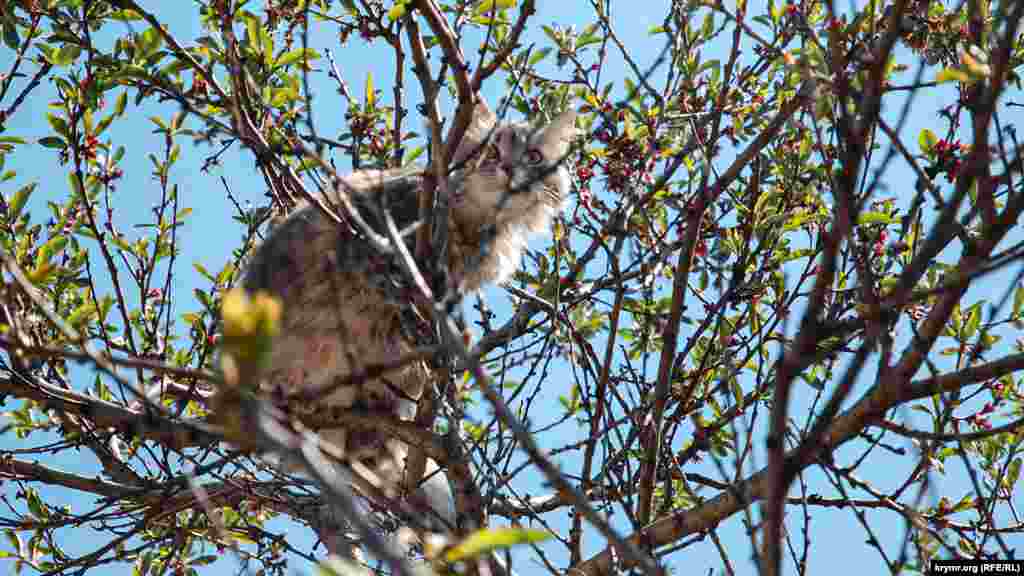 Севастополь. Мікрорайон «Гостряки». Кішка з приватного будинку на проспекті Генерала Острякова влаштувала полювання на птахів, які окупували персикове дерево. Полювання закінчилося нічим – пташки, побачивши кішку, розлетілися, домашня хижачка продовжила прогулянку без здобичі.