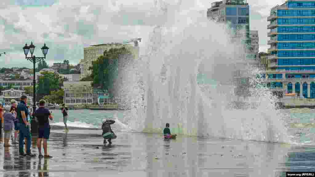 Севастопольську бухту штормить. Через розбурхане моря перестали ходити катери, але людей на міській набережній від цього не поменшало. Подивитися на хвилі зібралося чимало людей.
