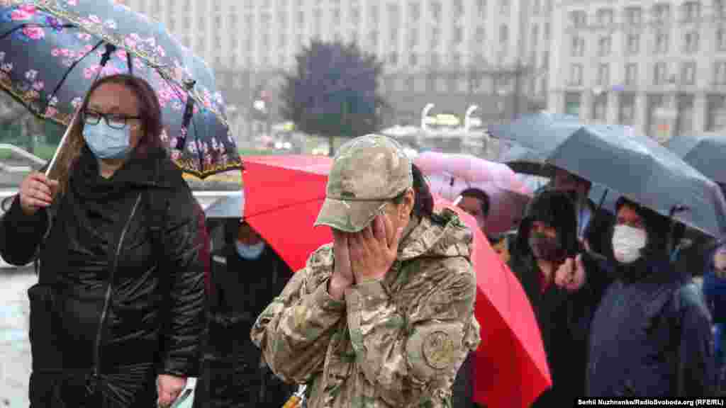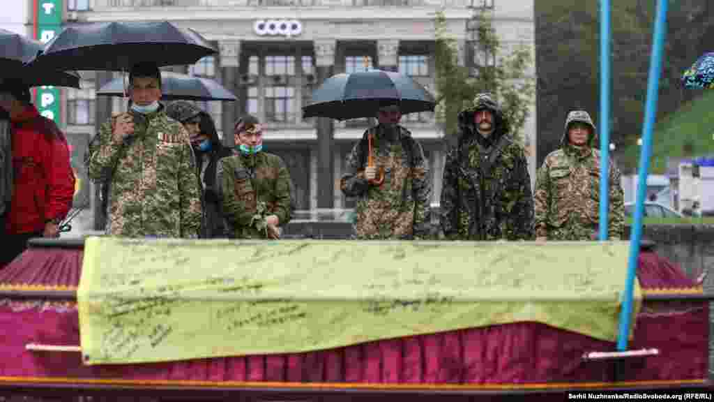 У Києві, на майдані Незалежності, попрощалися із військовим Миколою Микитенком, який підпалив себе на знак протесту. Попри погодні умови, попрощатися із ветераном бойових дій на Донбасі прийшло кілька десятків людей.