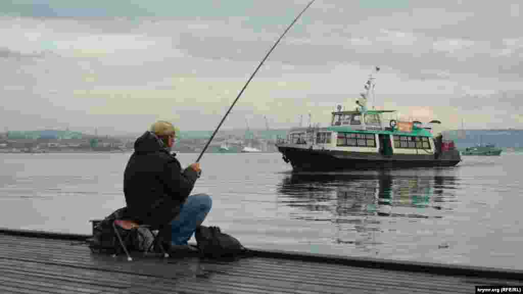 Севастопольський рибалка ловить рибу в бухті біля Графської пристані, де морська вода покрита плівкою з невідомих нафтопродуктів.