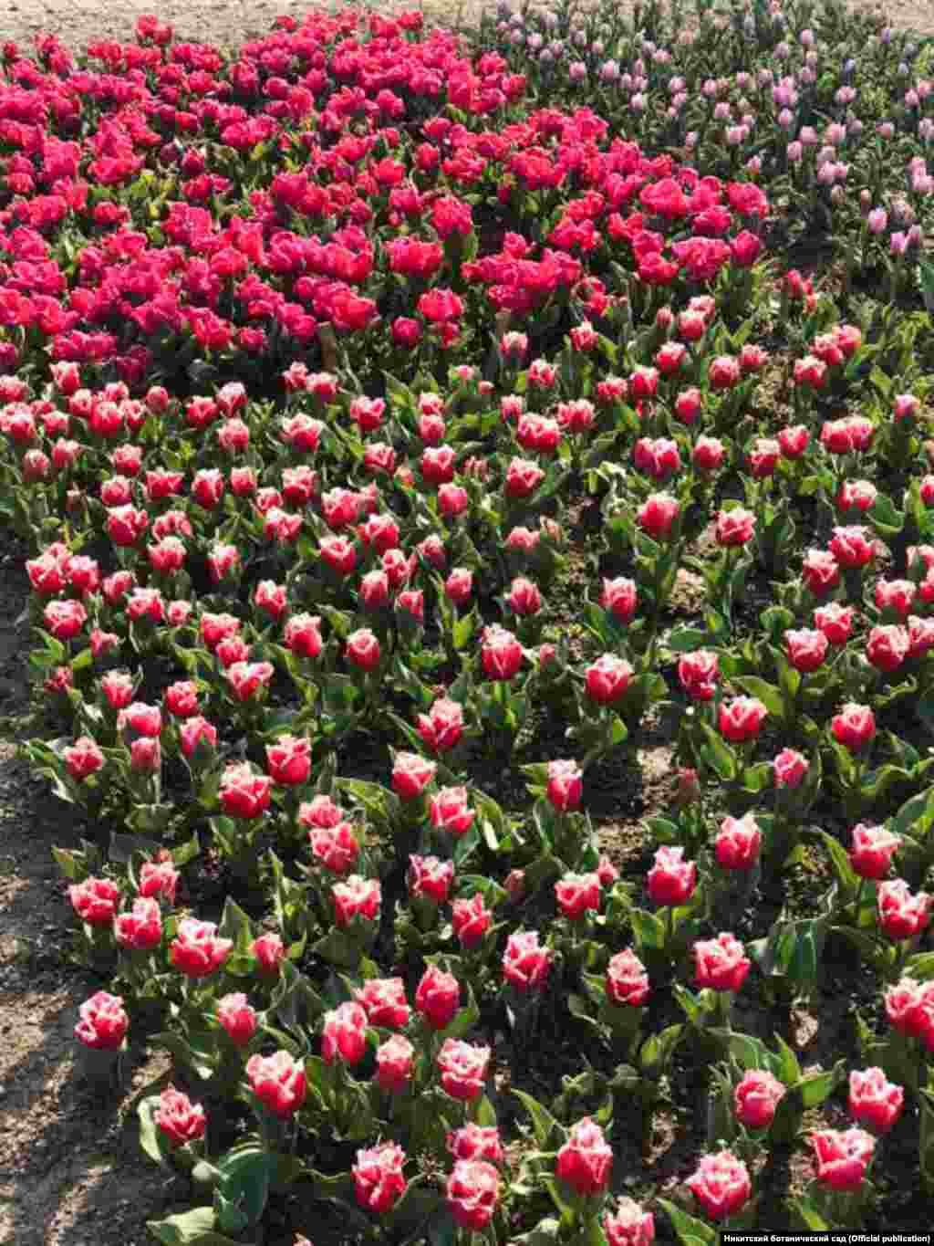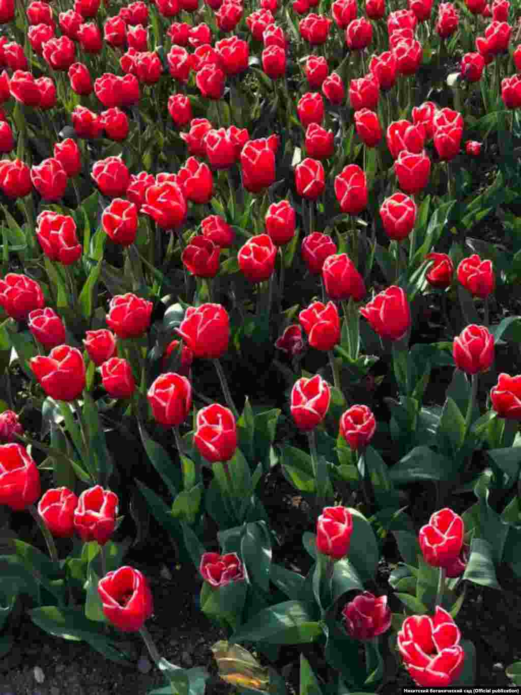 У Нікітському ботанічному саду почався «Парад тюльпанів» – сто тисяч квітів двох сортів висаджені у відкритому ґрунті. 130 голландських сортів-інтродуцентів (рослин, вирощених у ґрунті, за межами ареалу їх поширення) – новинки на експозиційній ділянці.