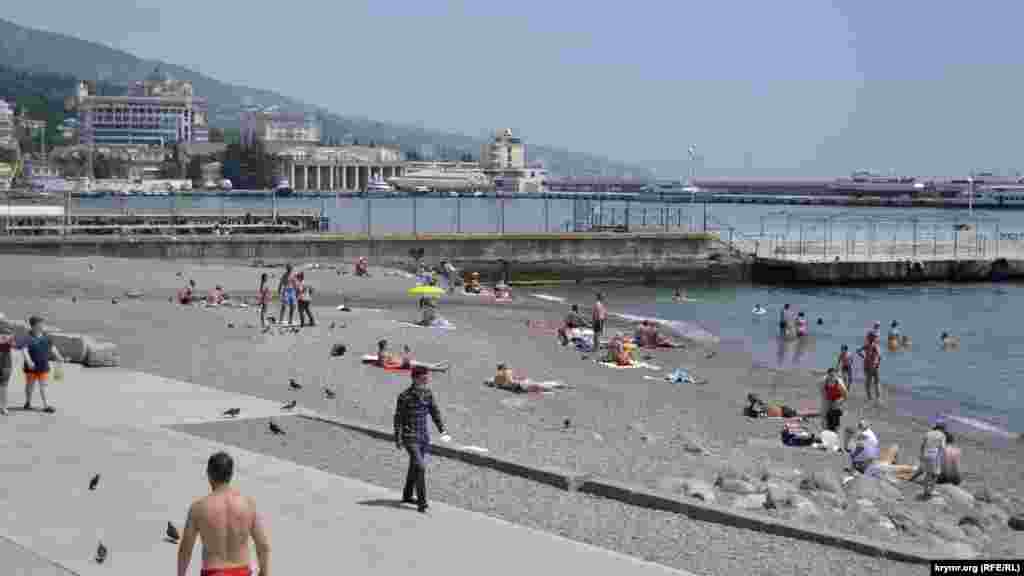 В Ялті на старті туристичного сезону відпочивальників не так багато, і їм вдається дотримуватися рекомендованої дистанції на пляжах. Ялтинську набережну миють спеціальними машинами, але подекуди не встигли встановити лавки, зняті на зиму. Зате потроху розташовують торговельні ряди, а прогулянкові яхти чекають пасажирів на пристанях.