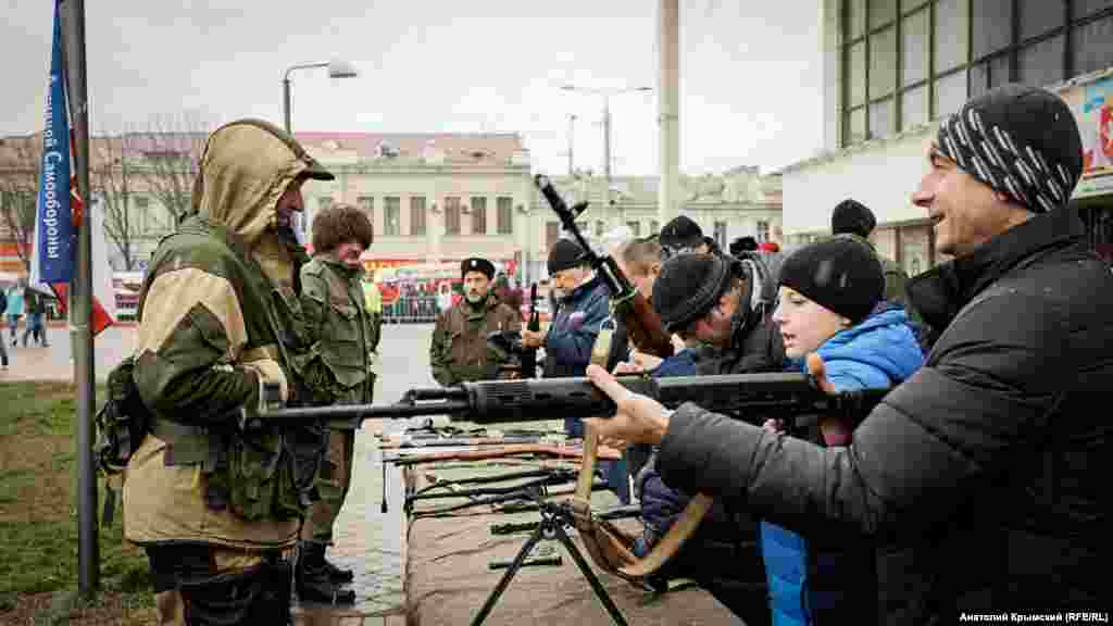 23 лютого в Росії відзначають «День захисника Вітчизни» і століття Радянської армії. На головній площі Сімферополя до цієї дати приурочили виставку військової техніки. Штатну стрілецьку, артилерійську, зенітне озброєння і бронетехніку представили військовослужбовці 126-ї окремої бригади берегової оборони з Перевального, інших частин російського Чорноморського флоту, а також місцевого з'єднання Росгвардіі. Водночас представники МНС намагалися зацікавити народ квадроцикламі і снігоходами. До святкування підключилося і місцеве російське козацтво зі своїми батогами і шаблями. Там же, на площі Леніна, був організований продаж радянської та сучасної російської військової атрибутики.